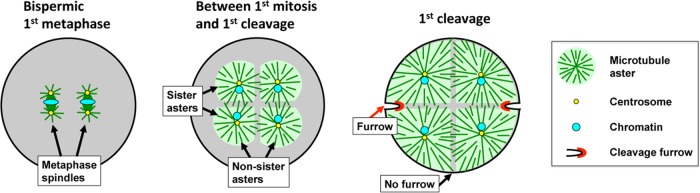 Cleavage pattern in a bispermic frog egg. Metaphase spindles in Xenopus are ∼50–60 μm long in a 1.2-mm egg. After anaphase onset, the small asters at the spindle poles grow steadily until they fill the cell. Asters from the two poles of the same spindle (sister asters) contact each other soon after anaphase onset at the plane previously occupied by the metaphase plate. Asters from the poles of two different spindles (nonsister asters) contact each other later. In both cases, aster growth halts where the asters contact each other, and a zone of lower microtubule density is observed at the aster–aster interaction zone (gray shading). When asters grow to touch the cortex, furrows initiate between sister aster pairs but not between nonsister pairs. Adapted from Brachet (1910), Wühr et al. (2009), Snook et al. (2011), and Mitchison et al. (2012). |