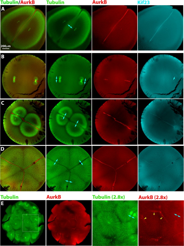 FIGURE 2: Localization of furrow-inducing protein complexes in polyspermic eggs. Eggs were fixed between first mitosis and first cleavage, stained for AurkB (a subunit of the CPC) and Kif23 (a subunit of Centralspindlin), and imaged by confocal microscopy. Cyan double-headed arrows illustrate sister aster pairs. (A) Normal, monospermic egg. Note plane of CPC- and Centralspindlin-positive microtubule bundles between sister asters. (B) Bispermic egg fixed a few minutes after anaphase onset. The asters have just started to grow. A CPC-positive disk is evident at the plane previously occupied by the metaphase plate, where sister asters recently met. Centralspindlin recruitment is less evident (cyan single arrow in Kif23 image). (C) Bispermic egg fixed midway between anaphase and cleavage. Interaction zones between sister and nonsister asters were evident in the tubulin image. Note a brighter tuft of microtubules that connects the sister pair to the upper left, in register with the centrosomes. This midzone-like morphological marker reveals the previous position of the spindle and was used to identify sister aster pairs in microtubule images. CPC and Centralspindlin have been recruited to the interaction zone between sister asters but not to the zone between nonsister asters. (D) Egg with four sperm fixed early in cleavage. Cleavage has initiated near the animal pole (not shown). This image shows a focal plane near the equator, where three aster pairs are visible. Furrowing had not yet occurred in this focal plane, but asters had grown all the way to the cortex. Note selective recruitment of CPC and Centralspindlin to zones between sister asters. (E) Highly polyspermic egg fixed early in cleavage. The region presented at higher magnification shows a single aster with CPC-positive zones at the junction with several neighboring asters (yellow arrowheads). None of these are zones with its sister aster, which is in a different z-plane. |