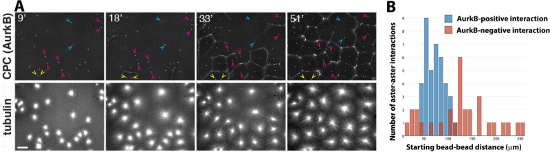 FIGURE 6:. Initial distance between nucleating sites influences CPC recruitment. The same experiment as in Figure 5 was performed without molecular perturbations. The CPC probe is directly labeled anti-AurkB, and beads coated with anti-AurkA are the aster nucleators. Bead pairs were identified based on whether their asters interacted at the end of the movie. The distance between the bead pairs was measured at the start of the movie, and whether or not a CPC-positive zone formed between beads was scored upon initial aster–aster contact. (A) Example images from a time-lapse sequence. Arrowheads indicate typical bead pairs. Yellow and blue show examples where AurkB-positive zones did not form between beads; magenta shows examples where AurkB-positive zones did form. Note that the yellow arrowheads are close together (n = 2), blue arrowheads are further apart (n = 7), and magenta arrowheads are separated by an intermediate distance (n = 15). (B). Histogram of initial bead separations plotted separately for bead pairs where an AurkB-positive zone did (blue bars; n = 39) or did not (red bars; n = 30) form upon aster–aster contact. Initial distances were pooled for multiple fields imaged in parallel in two independent experiments (six fields total). Note that the initial separation distance was unimodal for bead pairs for which a CPC-positive zone did form. The distribution was much more spread out, and possibly bimodal, for bead pairs for which a CPC-positive zone did not form. |