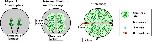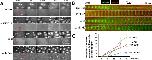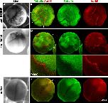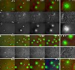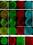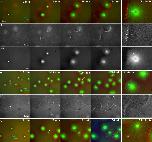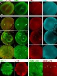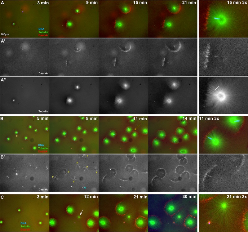 FIGURE 7:. Chromatin spatially biases CPC recruitment to monopolar sperm asters in egg extract. Permeabilized sperm was added to interphase egg extract supplemented with probes for DNA, tubulin, and the CPC (GFP-DasraA). (A–C) Image sequences chosen to emphasize different aspects of this reaction. The last in each series is a 3× magnification. Time points are as indicated. (A) Two isolated sperm asters. Note polarized microtubule distribution and formation of an arc of CPC-positive bundles on the periphery of each aster on the same side as the DNA. (A′) Only the DasraA channel for the same images as A. Note that the DasraA probe binds sperm chromatin. (A′′) Only the microtubule channel. (B) Field at higher sperm density. (B′) Same images in DasraA channel alone. Seven of eight of the asters polarize early (yellow p), and one aster never polarizes (cyan np). Later most asters contact a neighbor and form a CPC-positive interaction zone; yellow arrow at 11-min time point (B). (C) Field that includes a centrosome not attached to a sperm nucleus (white arrow in 12-min image). The centrosome nucleated a weaker aster than the sperm-attached centrosomes. The free centrosome aster did not recruit CPC to its periphery until it contacted a neighboring aster (30-min time point). The bright dot on the lower left side of the free centrosome aster is DNA without a centrosome. With regard to A–C, see Supplemental Movies 7A–7C, respectively. |