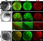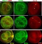 FIGURE 3: Forced activation of the CPC induces ectopic furrows. Monospermic eggs were injected after first mitosis (60–70 min postfertilization) and time-lapse imaged to score cleavage (A, C, E), or fixed around the time of first cleavage and stained for tubulin and AurkB for CPC (B, D, F). (A, B) Injection with an activating anti-INCENP IgG. (A) Note multiple ectopic furrows. (B) Note ectopic microtubule assemblies with CPC strongly localized to their peripheries. Furrows initiated where CPC planes touched the cortex (white arrows). (C, D) Injection with inhibitory IgG to MCAK (Kif2C), the predominant microtubule catastrophe factor in frog eggs. (C) Note multiple ectopic furrows. (D) Note ectopic, CPC-positive microtubule assemblies and associated ectopic furrows (white arrows) as in B. (E, F) Injection with buffer only. A single cleavage furrow forms (E and white arrow in F). |