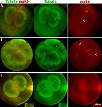 FIGURE 2:. Localization of furrow-inducing protein complexes in polyspermic eggs. Eggs were fixed between first mitosis and first cleavage, stained for AurkB (a subunit of the CPC) and Kif23 (a subunit of Centralspindlin), and imaged by confocal microscopy. Cyan double-headed arrows illustrate sister aster pairs. (A) Normal, monospermic egg. Note plane of CPC- and Centralspindlin-positive microtubule bundles between sister asters. (B) Bispermic egg fixed a few minutes after anaphase onset. The asters have just started to grow. A CPC-positive disk is evident at the plane previously occupied by the metaphase plate, where sister asters recently met. Centralspindlin recruitment is less evident (cyan single arrow in Kif23 image). (C) Bispermic egg fixed midway between anaphase and cleavage. Interaction zones between sister and nonsister asters were evident in the tubulin image. Note a brighter tuft of microtubules that connects the sister pair to the upper left, in register with the centrosomes. This midzone-like morphological marker reveals the previous position of the spindle and was used to identify sister aster pairs in microtubule images. CPC and Centralspindlin have been recruited to the interaction zone between sister asters but not to the zone between nonsister asters. (D) Egg with four sperm fixed early in cleavage. Cleavage has initiated near the animal pole (not shown). This image shows a focal plane near the equator, where three aster pairs are visible. Furrowing had not yet occurred in this focal plane, but asters had grown all the way to the cortex. Note selective recruitment of CPC and Centralspindlin to zones between sister asters. (E) Highly polyspermic egg fixed early in cleavage. The region presented at higher magnification shows a single aster with CPC-positive zones at the junction with several neighboring asters (yellow arrowheads). None of these are zones with its sister aster, which is in a different z-plane. |