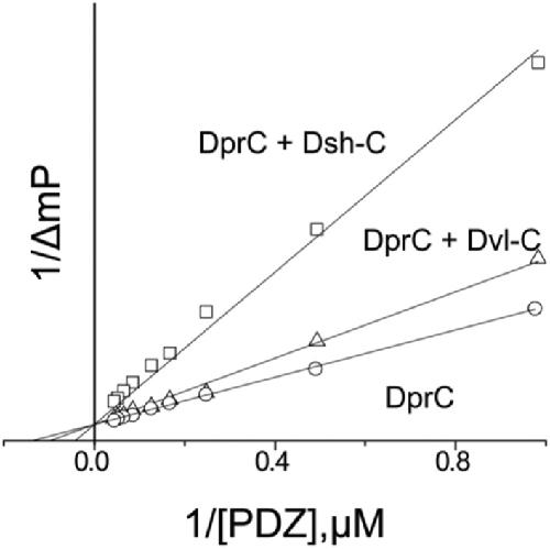 Figure 2. Competitive binding experiments.The KD value of the fluorescence-labeled Dapper (Dpr)-derived peptide Rox-DprC was obtained by plotting 1/ΔmP vs 1/[PDZ], where ΔmP is the fluorescence polarization change (×1000) of Rox-DprC and [PDZ] is the concentration of the PDZ domain of Dvl. The KI values of the Dvl-C and Dsh-C peptides were obtained by using the equation KDapp = (KD/(1 + [I]/KI)).DOI: http://dx.doi.org/10.7554/eLife.08142.004 |