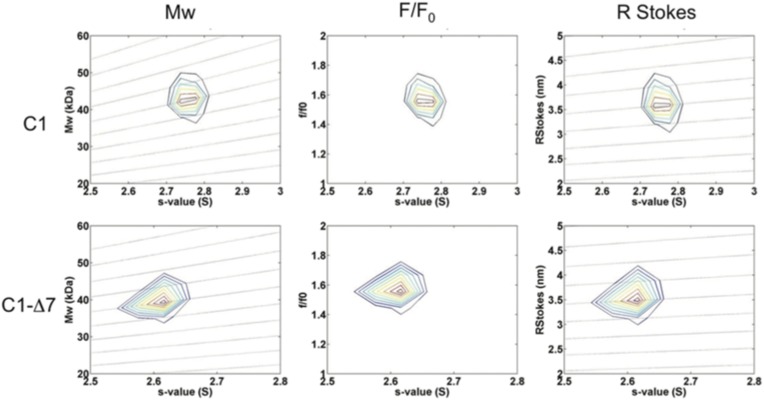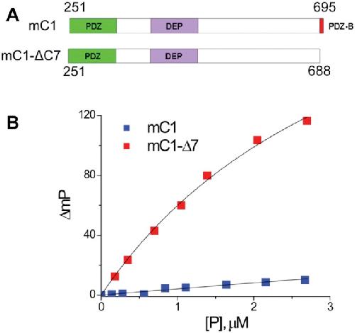 Figure 6. The binding pocket of the Dvl PDZ domain can be occupied by its intrinsic C-terminus.(A) Schematic representation of protein constructs mC1 (residues 251â695) and mC1-CÎ7 (residues 251â688) numbered according to the mouse Dvl-1 protein sequence. (B) Polarization change of the fluorescence-labeled peptide Rox-DprC (Rox-SGSLKLMTTV, derived from the C-terminus of Dpr) after addition of mC1-CÎ7 and mC1 proteins in 50 mM phosphate with 0.3 M NaCl and 6 mM β-mercaptoethanol. For the binding of Rox-DprC to mC1, KD is 3.8 ± 0.5 μM the value was obtained by fitting the titration data with the equation: ÎmP = ÎmPmax à [P]/([P] + KD), where ÎmP is the polarization change of Rox-DprC, [P] is the concentration of protein, and both KD and ÎmPmax are the fitting variables. For the binding of Rox-DprC to mC1-CÎ7, KD was estimated as 68 ± 5 μM. Because of the limitation in the titration study, to estimate the KD value, although we used the same equation to fit the titration data, in the fitting, Kd was the only variable and the maximum polarization change, ÎmPmax, was fixed to the value that was obtained in the titration study of Rox-DprC binds to mC1-CÎ7.DOI: http://dx.doi.org/10.7554/eLife.08142.011 |