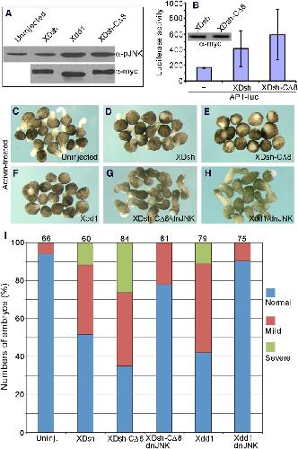 Figure 9. The open conformation of Dvl disrupts CE by activating Jun N-terminal kinase (JNK).(A) Western blot of phosphorylated JNK in ventral mesoderm cells overexpressing wild-type XDsh or its mutants. At equivalent protein level, Xdd1 and XDsh-CÎ8 more potently induce JNK phosphorylation than wild-type XDsh. (B) Xenopus 4-cell stage embryos were dorsally coinjected with equal quantities of wild-type XDsh mRNA or XDsh-CÎ8 mRNA (500 pg) and the AP1-luciferase reporter DNA (200 pg); luciferase activity was assayed at the late gastrula stage. Inset shows a representative Western blot using anti-myc antibody to control XDsh and XDsh-CÎ8 protein levels. Values are the mean and SD from three independent experiments (XDsh vs XDsh-CÎ8, p < 0.05). (CâH) The dominant negative JNK mutant (dnJNK) rescues activin-induced explant elongation blocked by overexpression of XDsh-CÎ8 or Xdd1. (C) Uninjected explants treated with activin show extensive elongation. (D) XDsh-injected explants treated with activin show moderate inhibition of explant elongation. (E) Injection of XDsh-CÎ8 strongly inhibits explant elongation. (F) Injection of Xdd1 similarly inhibits explant elongation as injection of XDsh-CÎ8. (G, H) dnJNK rescues explant elongation inhibited by XDsh-CÎ8 or Xdd1. (I) dnJNK also recues CE defects produced by overexpression of XDsh-CÎ8 or Xdd1 in whole embryos. Phenotypes are severe (green), mild (red), and normal (blue). Numbers on the top indicate total embryos scored from three independent experiments.DOI: http://dx.doi.org/10.7554/eLife.08142.014 |