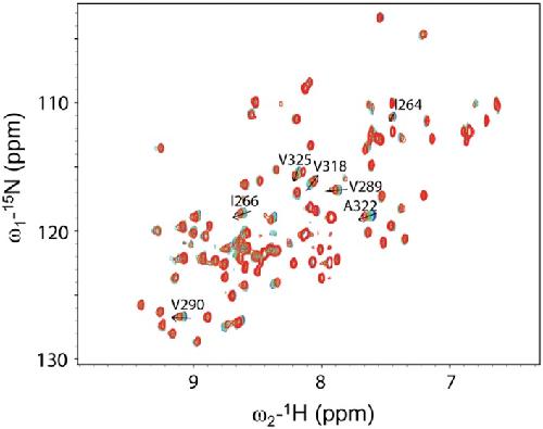 Figure 5—figure supplement 1. The mutant Dvl-1 PDZ (R322A) domain binds more weakly than wild-type Dvl-1 PDZ domain to the Dvl-C peptide.Overlap of the 1H-15N HSQC spectra of the labeled mutant Dvl PDZ (R322A) domain and the Dvl-C peptide. The mutation dramatically weakens interaction with the Dvl-C peptide (free: blue; final titration: red; final peptide:protein ratio = 4:1).DOI: http://dx.doi.org/10.7554/eLife.08142.010 |