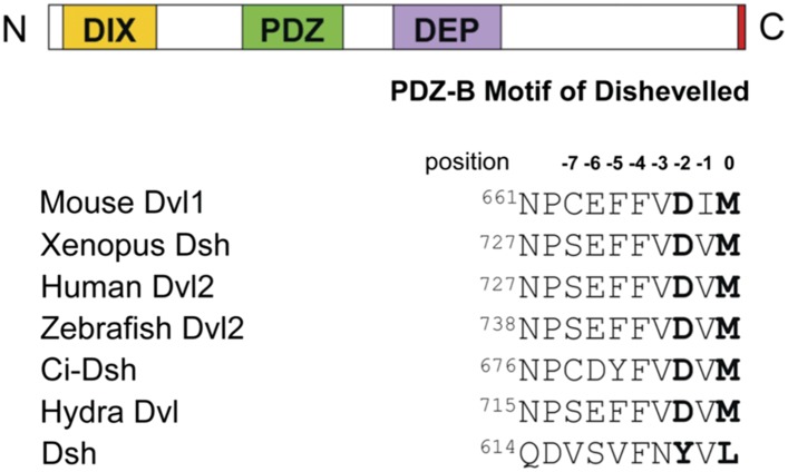 Figure 1. The C-terminal tail of Dishevelled (Dvl) is a PDZ domain binding motif.Sequence alignment of the C-terminus of Dvl/Dsh from selected species (Wallingford and Habas, 2005), showing residue numbers.DOI: http://dx.doi.org/10.7554/eLife.08142.003 |