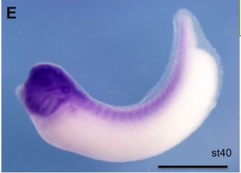 nf2 (NF2, moesin-ezrin-radixin like (MERLIN) tumor suppressor ) gene expression in Xenopus laevis embryo, assayed via in situ hybridization, NF stage 40, lateral view, anteriorleft, dorsal up.