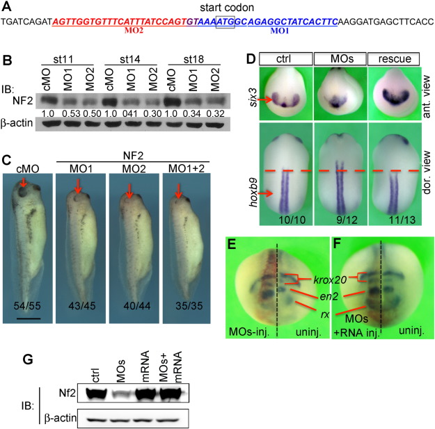 Fig. 3. Depletion of zygotic NF2 reduces anterior development. (A) Depiction of a part of nf2 cDNA sequence spanning the start codon (boxed) and the sequences complementary to the NF2 MOs. (B) Western blotting analysis for the endogenous NF2 protein in the control MO (cMO) and NF2 MO1-, or MO2-injected embryos at different developmental stages. β-Actin was used as a loading control. Each MO was injected at the dose of 40 ng per embryo. The numerical numbers indicate the relative expression levels of NF2 protein after normalized to the levels of β-actin. (C) Early tadpole stage embryos (st39/40) showing the phenotypic effects of zygotic NF2 depletion. Red arrows point to the encircling eyes. (D) Early tailbud stage (st23/24) embryos in situ hybridized with six3 and hoxb9. Upper panels: anterior view. Lower panels: dorsal view with anterior upwards. (E, F) Early tailbud stage embryos (dorsal anterior view) in situ hybridized with krox20, en2, and rx. (G) Western blotting analysis of NF2 protein in embryos at stage 15 with the indicated treatments. NF2 MOs were injected into both cells at 2-cell stage; MO-insensitive nf2 mRNA (200 pg) was injected into all four cells at 4-cell stage. The resultant embryos were lysed at stage 15. β-actin was used a loading control.