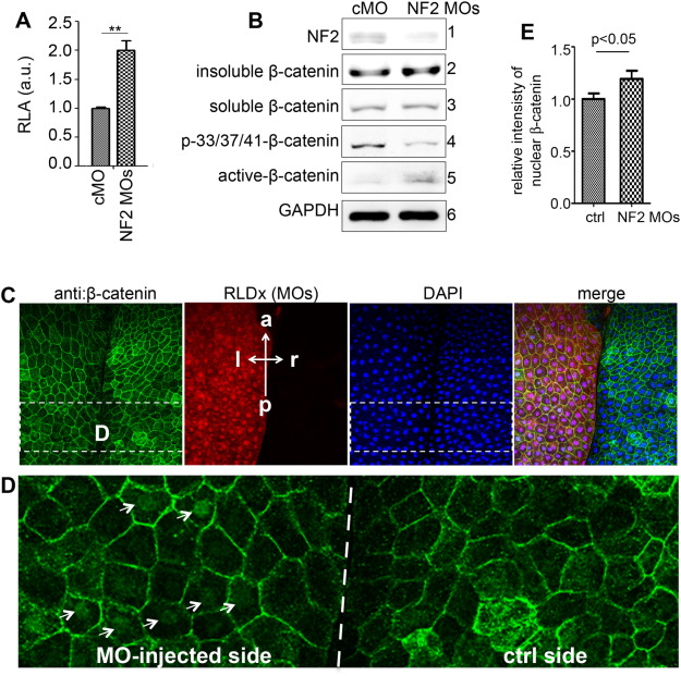 Fig. 4. NF2 depletion increases the Wnt/β-catenin signaling activity. Dual luciferase assay comparing the activities of TOP-flash reporter in cMO- and NF2 MO-injected embryos. cMO or NF2 MOs together dual luciferase reporter DNA were injected into two dorsal animal cells at the 8-cell stage, embryos were lysed at stage 15 for the detection of luciferase activities. (B) Western blotting analysis for NF2, β-catenin in the neural plate explants from cMO- or NF2 MOs-injected embryos. cMO or NF2 MOs were injected into two dorsal animal cells at the 8-cell stage and neural plates were dissected at stage 15 and subjected to western blotting analysis. GAPDH was used a loading control. (C, D) Comparison of the levels of nuclear β-catenin in control and NF2 MO-injected neural plate of Xenopus embryo at stage 15 side by side through indirect immunofluorescence analysis, indicating that the levels of nuclear β-catenin in NF2 depleted cells were higher than those in control cells. Photographs shown in panel C were acquired using a 20 à lens. The boxed area in panel C was digitally enlarged 4 times and displayed in panel (D). RLDx was used as a lineage tracer. The nuclei were counter stained with DAPI. (E) Quantitative comparison of the signal intensity of nuclear β-catenin in the neural epithelial cells in the uninjected and NF2 MOs-injected side of neural plate. p-Value was obtained through the student t-test.