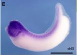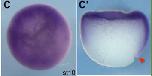 nf2 (NF2, moesin-ezrin-radixin like (MERLIN) tumor suppressor) gene expression in Xenopus laevis embryo, assayed via in situ hybridization, NF stage 10, (C) dorsal view, anterior up. (C') in midsagittal section, dorsal right.
