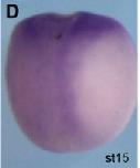 Fig. 1. Expression pattern of nf2 in early Xenopus laevis development. (A) qPCR analysis of nf2 mRNA expression in the different stages of early development. The relative expression of nf2 mRNA was normalized to that of odc. (BâE) Embryos at different stages in situ hybridized with nf2. (B) 4-Cell stage, animal view. (C) Early gastrula (st10), animal view. (Câ²) Early gastrula viewed from a bisection surface, dorsal to right, red triangle points to dorsal lip. (D) Early neural stage (st15), dorsal view. (E) Stage 40, lateral view. Scale bar: 1 mm.