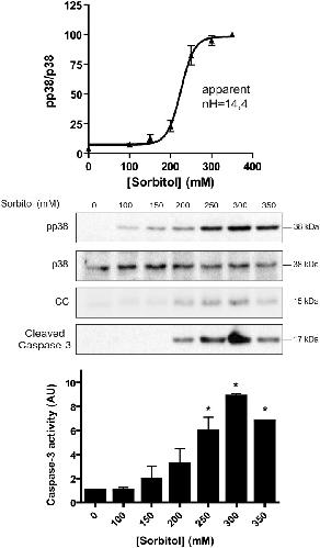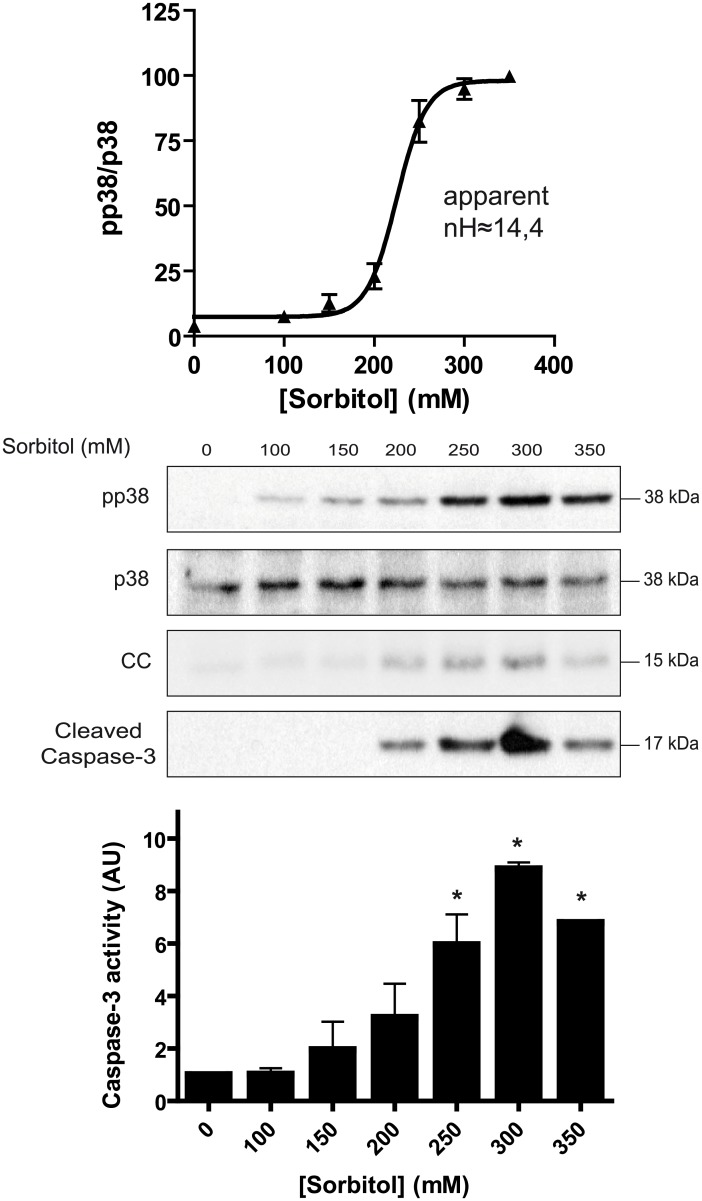 Fig 2. p38 is ultrasensitive to hyperosmolar sorbitol.Oocytes were treated with increasing concentrations of sorbitol for 4 h and pools of 20 oocytes were collected and lysed to analyze pp38, p38, cytochrome c (CC), and cleaved caspase-3 by Western blot. p38 activity is represented as pp38/p38 ratio, giving 100% value to the highest activity. Results are represented as mean ± SEM of four independent experiments. Hill coefficient (nH) was calculated with SAS 9.2 informatics program and represented with GraphPad Prism 4 program. A representative Western blot is shown. Caspase-3 activity was determined at different concentrations of sorbitol as reported before. Data are represented as mean ± SEM (n = 3), *p<0.05 (ANOVA and Dunnett’s test) comparing with non treated oocytes.