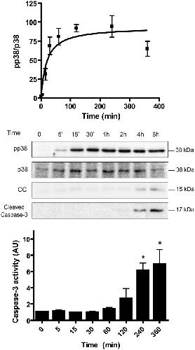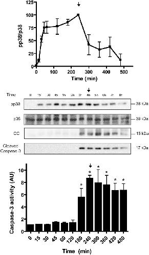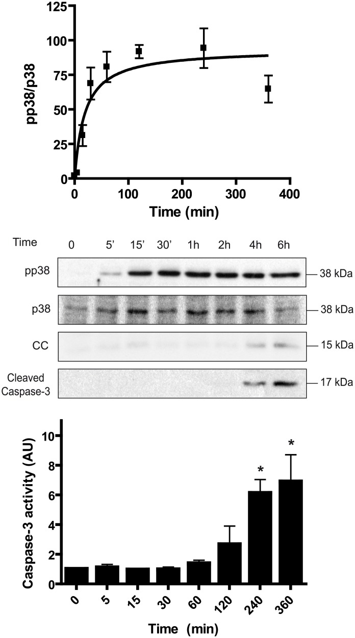 Fig 3. Monostability in the p38 signaling system.Time course of p38 activation in oocytes treated with 300 mM sorbitol. After 4 h of treatment (arrow), oocytes were washed several times with MBS and maintained in MBS without sorbitol. Pools of 20 oocytes were collected at different times to determine pp38, p38, cytochrome c (CC), and cleaved caspase-3 by Western blot. p38 activity is represented as pp38/p38 ratio, given 100% value to the highest activity. Results are represented as mean ± SEM of three independent experiments. A representative Western blot is shown. Caspase-3 activity was determined as reported before. Data are represented as mean ± SEM (n = 3), *p<0.05 (ANOVA and Dunnett’s test) comparing with non treated oocytes.