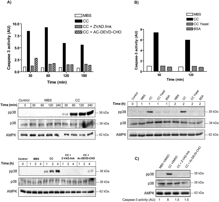 Fig 5. Microinjection of cytochrome c (CC) induces caspase-3 activation and p38 phosphorylation.(A) Caspase inhibitors reduce p38 phosphorylation induced by cytochrome c injection. Oocytes were injected with MBS, horse cytochrome c (CC) (0.5 μM final concentration), CC (0.5 μM) plus Z-VAD.fmk (5 μM), CC (0.5 μM) plus Ac-DEVD-CHO (100 nM), or non injected (control). Pools of 20 oocytes were collected at different times and caspase-3 activity was determined as the concentration of fluorescent AMC formation from Z-DEVD-AMC substrate, and represented as arbitrary units of caspase-3 activity, giving value 1 to MBS injected oocytes. pp38, p38 and AMPK (loading control) were analyzed by Western blot. The result presented is representative of three independent experiments. (B) Injection of BSA or cytochrome c from Saccharomyces cerevisiae (CC Yeast) does not induce caspase-3 activation and p38 phosphorylation. Oocytes were injected with MBS, horse cytochrome c (CC) (0.5 μM), yeast cytochrome c (CC Yeast) (0.5 μM), BSA (0.5 μM), or non injected (control). Pools of 20 oocytes were collected at different times and caspase-3 activity was determined as described before. pp38, p38 and AMPK were analyzed by Western blot. (C) DMSO injection does not interfere with p38 phosphorylation and caspase-3 activation induced by cytochrome c. Oocytes were injected with MBS plus DMSO (diluted 1:50 in MBS), horse cytochrome c (CC) (0.5 μM) plus DMSO (diluted 1:50 in CC), CC (0.5 μM) plus Z-VAD.fmk (50 μM), or CC (0.5 μM) plus Ac-DEVD-CHO (1 μM). Pools of 20 oocytes were collected at different times and caspase-3 activity was determined as described before. pp38, p38 and AMPK were analyzed by Western blot.