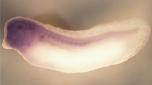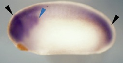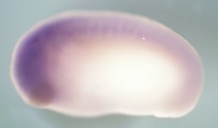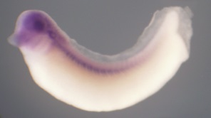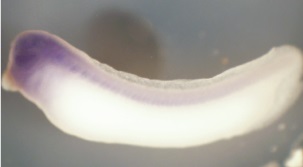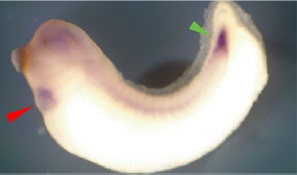fbxl19 (F-box and leucine-rich repeat protein 19) gene expression in Xenopus laevis embryo, assayed via in situ hybridization, NF stage 26, lateral view, anterior left, dorsal up. |