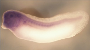 fbxo11 (F-box protein 11) gene expression in Xenopus laevis embryo, assayed via in situ hybridization, NF stage 30, lateral view, anterior left, dorsal up. |