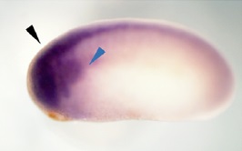 fbxl19 (F-box and leucine-rich repeat protein 19) gene expression in Xenopus laevis embryo, assayed via in situ hybridization, NF stage 10, lateral view, animal up. |