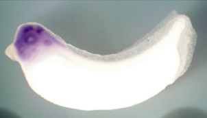 fbxw2 (F-box and WD repeat domain containing 2) gene expression in Xenopus laevis embryo, assayed via in situ hybridization, NF stage 26, lateral view, anterior left, dorsal up. |