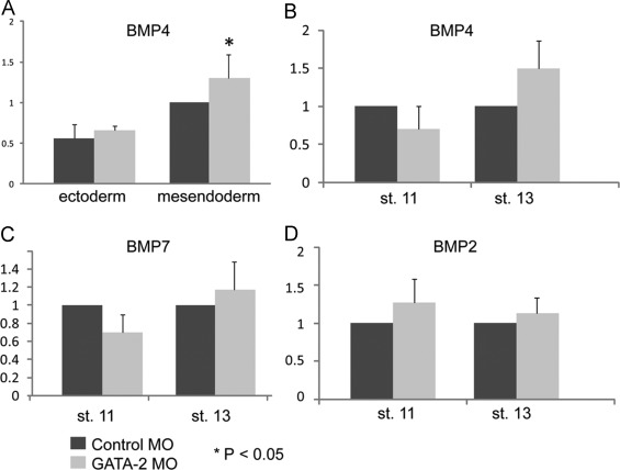 Fig. 4. GATA2 is not required for expression of Bmp2, Bmp4orBmp7during gastrulation. (A) GATA2 or control MOs (40 ng per embryo) were injected into two-cell embryos. At stage 13, the ventral half of the embryo was removed and dissected into ectodermal or mesendodermal pieces that were analyzed for expression of Bmp4 by qPCR. Quantification of relative gene expression (mean±SD) in four independent experiments is shown. (BâD) GATA2 or control MOs were injected into two-cell embryos and expression of Bmp4, 7, and 2 was analyzed by qPCR in whole embryos at stage 11. Quantification of relative gene expression (mean±SD) in three independent experiments is shown. |