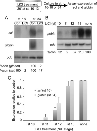Fig. 5. Upregulation of canonical Wnt signaling during gastrulation represses hematopoietic specification Schematic of approach used to transiently activate canonical Wnt signaling. Briefly, embryos at the stages specified were incubated in LiCl solution for 20 min, followed by several washes in 0.1X MBS culture medium. Embryos were allowed to develop to stage 16â18 or 34 and assayed for expression of globin and/or Scl. (A) Embryos were treated with LiCl at stage 10, allowed to develop to stage 18 or 34 and assayed for expression of Scl and/or globin by Northern blotting. Levels of globin or scl transcripts are normalized and reported as a percentage of globin or scl levels in untreated embryos below each lane. (B) Embryos were treated with LiCl at stages 10, 11, 12 or 13, allowed to develop to stage 34 and expression of globin was determined by Northern blotting. Levels of globin transcripts are normalized to and reported as a percentage of globin levels in untreated embryos below each lane. (C) Embryos were treated with LiCl at stages 10, 11, 12 or 13, allowed to develop to stage 16 or 34 and expression of scl or globin was determined by qPCR in three independent experiments. |