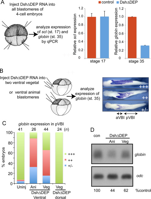 Fig. 7. Non-canonical Wnt signaling is required in ectodermal and mesodermal cells for primitive erythropoiesis. (A) RNA encoding DshâDEP (500 pg) was injected into each blastomere of 4-cell embryos as illustrated and expression of scl and globin was analyzed by qPCR at stage 17 and stage 35, respectively. (BâD) RNA encoding DshâDEP (750 pg) was injected into each ventral animal pole or ventral vegetal pole blastomere of 8-cell embryos as illustrated. (C) Expression of globin was analyzed by WMISH at stage 34 and globin staining in the posterior VBI (pVBI) was scored as barely or not detectable (â/+), moderately decreased (++) or strong (+++) using the scale illustrated on the right in panel C. (D) Expression of globin was determined by Northern blotting at stage 34. Levels of globin transcripts are normalized to and reported as a percentage of globin levels in control embryos below each lane. In this blot, the control lane contains RNA from CS2+ injected embryos and is the same control shown for Fig. 6 since all samples were run on the same gel. Results were replicated in two additional experiments. |