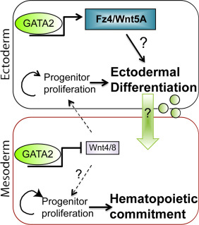 Fig. 8. Model of how GATA2 regulates the balance of Wnt signaling to promote hematopoietic commitment. During normal primitive hematopoiesis, GATA2 induces expression of non-canonical Wnt signaling components, such as Fz4 and Wnt5A in ectodermal cells, and represses expression of the canonical Wnt ligands Wnt4 and Wnt8 in mesodermal cells. Downregulation of canonical Wnt tips the balance away from progenitor proliferation and toward commitment/differentiation. In the mesoderm, this enables progenitors to commit to a hematopoietic fate. In the ectoderm, we hypothesize that differentiation is required for cells to generate a secondary signal (green arrow and circles) that is transmitted to mesodermal cells, enabling them to commit to a blood fate. |
