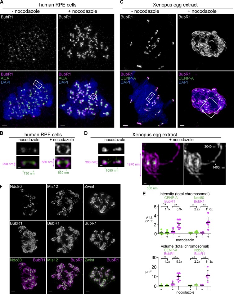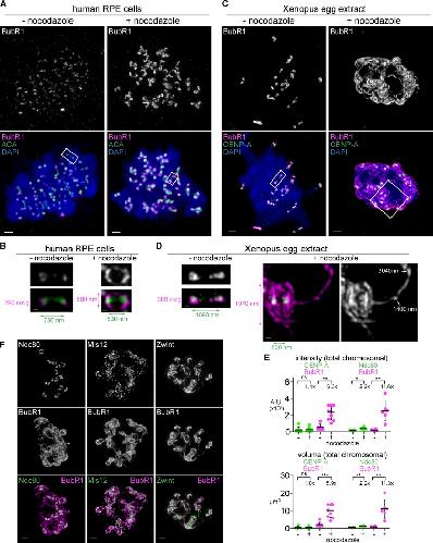Figure 1. Kinetochores expand by forming micrometer-scale fibrous structures that extend throughout the chromosome mass in the absence of microtubules. (AâD) Comparison of mitotic chromosomes and kinetochores in human RPE-hTERT cells (A and B) and Xenopus egg extracts (C and D) in the presence (right) or absence (left) of 33 µM nocodazole to completely depolymerize microtubules (not depicted). Each image represents a set of chromosomes derived from a single nucleus. Centromeres are stained (green) with CREST antisera (A and B) or CENP-A (C and D) and costained for the outer kinetochore protein BubR1 (magenta) and DAPI (blue). All chromosomes (A and C; bars, 1 µm) and blowups of sister centromeres (B and D; bars, 0.2 µm) are shown at the same magnification to allow size comparison. (B and D) Colored arrows indicate lengths of maximum BubR1 signal perpendicular to the centromereâcentromere axis (magenta) and the distance between centroids of centromere signals (green). White arrows indicate length measurements of traces along the filamentous structure beginning from the centroid of the nearest CENP-A focus. (E) Quantification of the total kinetochore staining on the chromosome cluster. Mean and standard deviation plotted in black. Mean values and fold change indicated above. MannâWhitney test: ns, P > 0.5; *, P < 0.05; **, P < 0.01; ***, P < 0.001 (n = 4â10 nuclei). (F) Staining of KMN network components (green) in nocodazole-treated extracts costained with BubR1 (magenta, chromosomes not depicted). Bars, 1 µm. All images are maximum intensity projections of 3D-SIM datasets. A.U., arbitrary unit. |