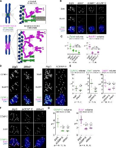 Figure 4. Formation of the expanded kinetochore requires outer kinetochore proteins and CENP-C. (A) Model of kinetochore expansion. Proteins present on the expanded kinetochore are shown in magenta, whereas the core kinetochore proteins are in green. Question marks indicate sites of potential oligomerization. (B–G) Mitotic chromosomes assembled in Xenopus egg extracts after depletion indicated, treated with nocodazole, and stained for the kinetochore proteins indicated. Bars, 1 µm. (C, E, and G) Quantification of total signal from chromosome clusters in extracts from B, D, and F. P-values from Mann–Whitney test and percentage of mean value relative to ΔIgG are indicated above each condition. Mean and standard deviation are plotted in black. All images are maximum intensity projections of 3D-SIM datasets. |