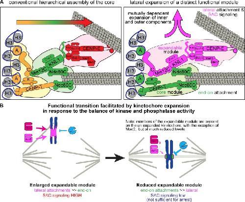 Figure 8. Assembly of distinct functional modules within the kinetochore. (A) Comparison of the conventional view of kinetochore structure and assembly with our model of the kinetochore as distinct functional domains: an expandable and core module, each comprised of both inner and outer kinetochore components. Arrows indicate the direction of kinetochore assembly. (B) Schematic of the functional transition promoted by the dynamics of the expandable module. |