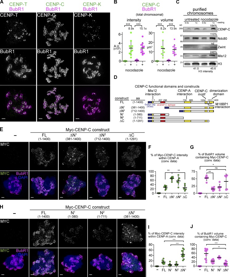 Figure 2. CENP-C is a component of the expanded kinetochore. (A) Staining of CCAN proteins (green) in nocodazole-treated extracts costained with BubR1 (magenta, chromosomes not depicted). (B) Quantification of the total kinetochore staining on the chromosome cluster. Mean, standard deviation, and fold change indicated in black (n = 8–10 nuclei). (C) Western blots of chromosomes purified from untreated or nocodazole-treated extracts. Percent values calculated by correcting raw values with the ratio of H3 signal. (D) Schematic of Xenopus CENP-C protein and constructs used in D–I. (E) Mitotic chromosomes assembled in extracts in which the indicated 6×Myc–CENP-C construct was expressed. (F and G) Quantification of data from D, comparing the Myc signal to CENP-A or BubR1 staining. (H–J) Sample preparation and quantification as in E–G. Mann–Whitney test: ns, P > 0.5; *, P < 0.05; **, P < 0.01; ***, P < 0.001. All images are maximum intensity projections of 3D-SIM datasets; bars, 1 µm. A.U., arbitrary unit. |
