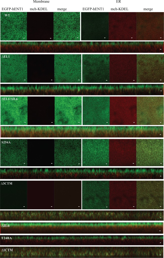 Fig 3. Intracellular distribution of the hENT1 variants.Shown are the confocal images for WT hENT1, ∆EL1, and ∆EL1/∆IL6 loop deletion mutants, S254A point mutant, ∆3CTM carboxyl-terminus deletion mutant expressed in X. laevis oocytes. Two images were taken: one on the plasma membrane (left panel) and the other deep within the cell showing the ER structure (right panel). Only the orthogonal sections are shown for ∆IL6, T248A and ∆1CTM. Left panel shows normal distribution of EGFP (green) on the membrane and mch-KDEL (red) in the ER for the WT, T248A and S254A. In contrast, ∆EL1, ∆IL6, ∆EL1/∆IL6 shows some co-localization of hENT1 and KDEL in the ER. Carboxyl-terminal deletions did not show EGFP fluorescence on the membrane. Instead, EGFP was present within the ER, co-localized with mch-KDEL. All the confocal images show a single, representative, section of a Z-series taken through the entire cell. Images are representative of 30 oocytes. Scale bar = 5μm.