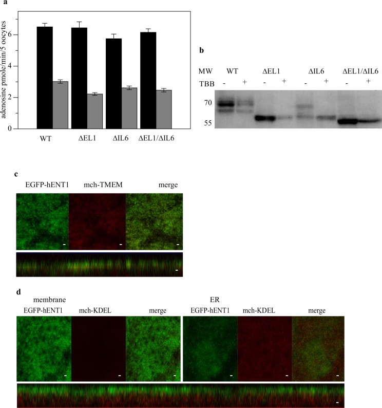 Fig 6. Effect of TBB on the deletion constructs.(a) Uptake of 5 μM 14C-adenosine after 1 minute incubation period without (black) and with (gray) pre-incubation with TBB. Values are expressed as mean ± SE for 5 oocytes for 3 independent experiments done in triplicate. (b) Western blot of the oocytes with and without treatment with TBB probed with EGFP monoclonal antibody. (c) Confocal images of oocytes co-injected with RNA expressing WT EGFP-hENT1 and mch-TMEM after treatment with 25 μM TBB for 12 hr. (d) Confocal images of oocytes co-injected with RNA expressing WT EGFP-hENT1 and mch-KDEL. Images were taken along the plane of the microvilli (left) and within the ER (right).