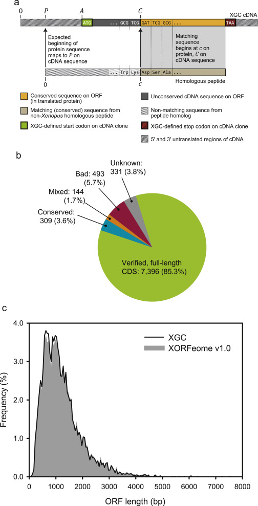 Fig. 2. Testing the full-length status of the XGC ORFs (a) using protein alignment: translated protein alignments to non-Xenopus species yields a predicted position for the start codon on a zero-based scale running from 5′ to 3′ along the length of the cDNA sequence. The position of the XGC-defined start codon on the clone cDNA sequence is marked as AA. The start of conserved protein alignment on the XGC cDNA sequence is labelledCC, and PP is the predicted position of the start codon based on the length of the protein sequence, i.e. P=C−cP=C−c, where cc is the position of the start of conservation on the non-Xenopus protein sequence. The minimum possible value of CC is zero, but PP can be negative. For each XGC ORF, PP and CC were averaged over all the respective homologous protein alignments to produce single, average values for P¯ and C¯, respectively. (b) Analysis of the XGC ORFs, over all tests, predicts 85% of the Xenopus ORFeome v1.0 to be full-length (89% including conserved ORFs, see Section 2). (c) Frequency distribution of open reading frame lengths in the source XGC cDNA library and the consolidated Xenopus ORFeome collection, showing equal likelihood of cloning long and short ORFs. |