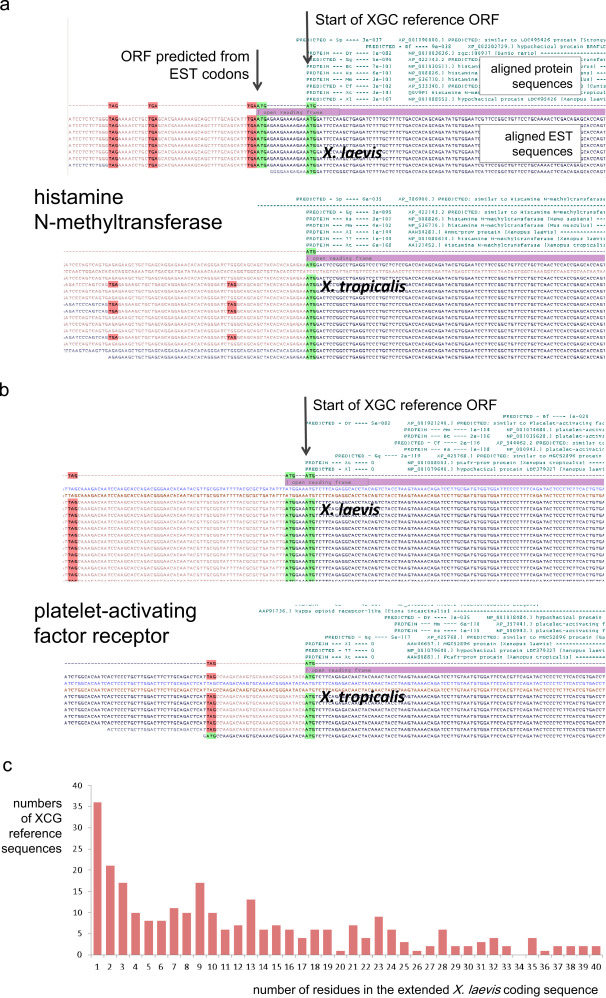 Fig. 3. Truncated but conserved ORFS. Examples of genes where the open reading frame in X. laevis is slightly longer than in other species, including X. tropicalis, suggesting that the shorter ORFeome clone, based on the XGC predicted ORF, is conserved and likely to be functional. Sections of EST clusters showing aligned nucleotide sequences (ESTs) with in-frame stop and ATG codons in red and green respectively. ORF predicted from aligned EST codons is in purple. Start of the XGC reference ORF is indicated by arrow. Protein alignments are shown above in turquoise, with the leftmost ‘P’ being the predicted relative position of the N-terminal end of these proteins. (a) The extremely highly conserved N-terminus of histamine N-methyl transferase is extended by 15 bp. (b) The moderately conserved N-terminus of platelet-activating factor receptor is extended by 6 bp compared to Xenopus tropicalis, and both are longer then the chick, human, mouse and zebrafish proteins. Note the erroneous prediction for the Xenopus laevis protein in both cases. (c) Distribution of the numbers of lost N-terminal residues between the shorter, conserved XGC reference ORFs and the longer true ORFs in Xenopus laevis. |