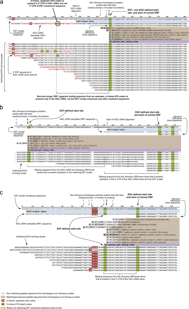 Fig. 4. Example alignments of XGC cDNA sequences and matching EST clusters. (a) Brain and reproductive organ-expressed protein (TNFRSF1A), illustrating divergence between the XGC sequence and the cluster consensus sequence, and adding 60 bp to an upstream ATG. Genomic alignment indicates (data not shown) this to be a non-canonical exon; we note that the XGC prediction was for the canonical start of translation. (b) CWF19-like 2, cell cycle control (cwf19l2), illustrating 5â² truncation of the entire cDNA sequence (i.e. the ORF and 5â² UTR). The EST cluster and conserved homologous peptide sequences contain additional sequence that is not present in the 5â² UTR of the XGC clone. Some interposing sequence is not shown; the numbered, horizontal scale has been clipped and compressed for clarity. (c) Lymphocyte cytosolic protein 1 (L-plastin), illustrating a 5â² truncated XGC ORF due to erroneous identification of the correct start codon. In this case, the 5â² UTR of the XGC cDNA contains the extra matching coding sequence from the EST cluster, and is supported by matching alignment of conserved homologous peptide sequence from non-Xenopus species. |