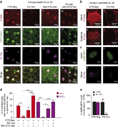 Figure 7. The direct repression of RRAS by miR-449 affects multiciliogenesis and apical actin cap formation in Xenopus.(a,b) Eight-cell stage Xenopus embryos were injected in the epidermis precursor blastomeres with a mixture of synthetic mRNA coding for GFP-CAAX to label the injected cells (in green, a2,6,10,14) and negative control MO (CTR-Neg, a1â4, b1,2), or a morpholino protecting rras against binding by miR-449 (PO-rras, a5â8, b3,4) or a morpholino blocking the translation of rras (MO-ATG-rras, a9â12), or a combination of PO-rras and MO-ATG-rras (a13â16). MCCs are stained with an anti-acetylated tubulin antibody (in magenta, a3,7,11,15 and c2,4), F-actin with phalloidin (red, a1,5,9,13 and b1â4). (b) The impact of Po-rras in MCCs on apical (upper b5) and sub-apical actin (lower b6) was observed with F-actin staining. (c) In independent experiments, we used rGBD-GFP to examine RhoA activity in Xenopus MCCs (c1â4). Eight-cell stage Xenopus embryos were injected in the epidermis precursor blastomeres with a reporter of RhoA activity (rGBD-GFP in green, c1â4) and with negative control MO (CTR-Neg, c1â2) or with PO-rras (c3â4). MCCs are stained in magenta (c2,4). Protecting the rras mRNA from interaction with miR-449 results in defects in actin cap formation (F-Actin, a5 and b3,4) together with a loss of MCCs (Ac. Tub., a7,c4) without affecting apical RhoA activity (rGBD-GFP, c1,3). This phenotype is rescued when the translation of the protected rras mRNA is blocked by coinjection of MO-ATG-rras (a13â16). (d) The histogram indicates the percentage of injected cells (positive for mGFP) that develop proper apical actin cap (in red) and motile cilia (in magenta) in Xenopus epidermis at stage 25. CTR-Neg, n=10 embryos per 413 injected cells; PO-rras, n=8 embryos per 350 injected cells; MO-ATG-rras, n=8 embryos per 290 injected cells; MO-PO-rras+MO-ATG-rras n=9 embryos per 395 injected cells (***P=0.009 and P<0.0001, and **P=0.0016; MannâWhitney test). Data are mean±s.e.m. (e) The histogram indicates the percentage of rGBD-GFP-positive cells stained for α-tubulin (α-tub. in black) or acetylated tubulin (Ac. Tub. in magenta) in PO-rras morphants (PO-rras, n=150) in comparison with the negative control (CTR-Neg, n=110). (**P<0.005; ns, no significant; one-way-analysis of variance with Dunnett's test). Data are mean±s.e.m. |
