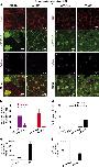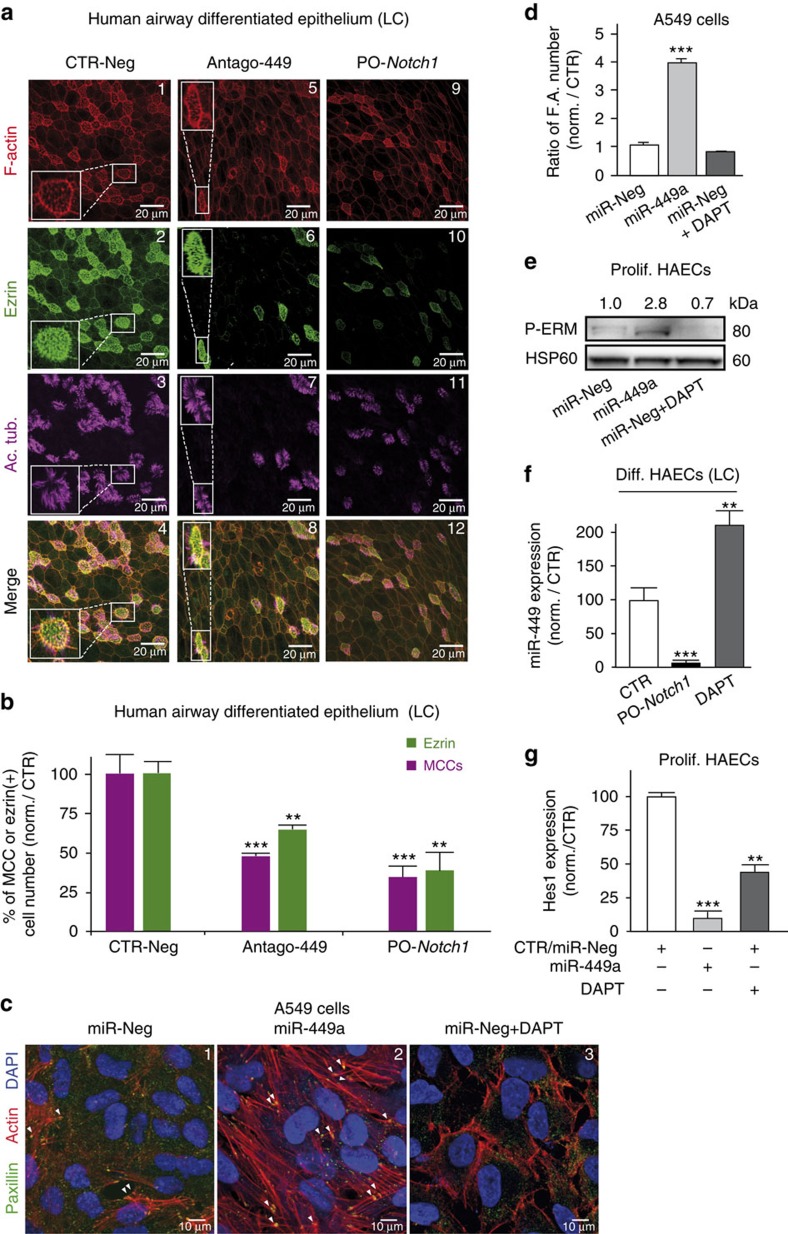 Figure 1. MiR-449 affects actin network remodelling and multiciliogenesis in HAECs.(aâc) Effect of a treatment by control antagomiR (CTR-Neg), anti-miR-449a/b (Antago-449) and miR-449::Notch1 protector (PO-Notch1) on differentiating HAECs. (a) Staining for F-actin (a1,5,9), ezrin (a2,6,10) and acetylated tubulin (a3,7,11), at LC stage. (b) The histogram indicates the average percentage of MCCs (in magenta) and apical ezrin-positive (in green) cell number relative to control (means±s.d. from nine and three donors for MCC and ezrin quantifications, respectively. ***P<0.001, **P<0.01; Student's t-test). (c) Immunostaining of focal adhesions protein Paxillin (in green), F-actin (in red) and nuclei (in blue) in A549 epithelial cells transfected for 72âh with control miRNA (miR-Neg), miR-449a or miR-Neg plus 10âμM DAPT. (d) Ratio of focal adhesion number per cell, normalized to control (n=5 fields in three independent experiments; ***P<0.001; Student's t-test). (e) Effect of miR-449 overexpression and DAPT (10âμM) on ERM phosphorylation in proliferating HAECs. Phosphorylated protein levels were normalized with non-phosphorylated ERM and with an antibody against HSP60 as a loading control. Normalized fold changes are indicated on the corresponding bands. Experiments were representative of three donors. (f) Effect of PO-Notch1 and DAPT (10âμM) in differentiating HAECs at LC stage on miR-449 expression, normalized with RNU44. (g) Real-time RTâPCR of HES1 transcripts in control, DAPT (10âμM, 48âh)-treated or miR-449-overexpressing proliferating HAECs. Transcript levels of HES1 were normalized against UBC transcript as an internal control. (f,g) Data represent the mean and s.d. of three independent experiments (***P<0.001, **P<0.01; Student's t-test). |