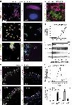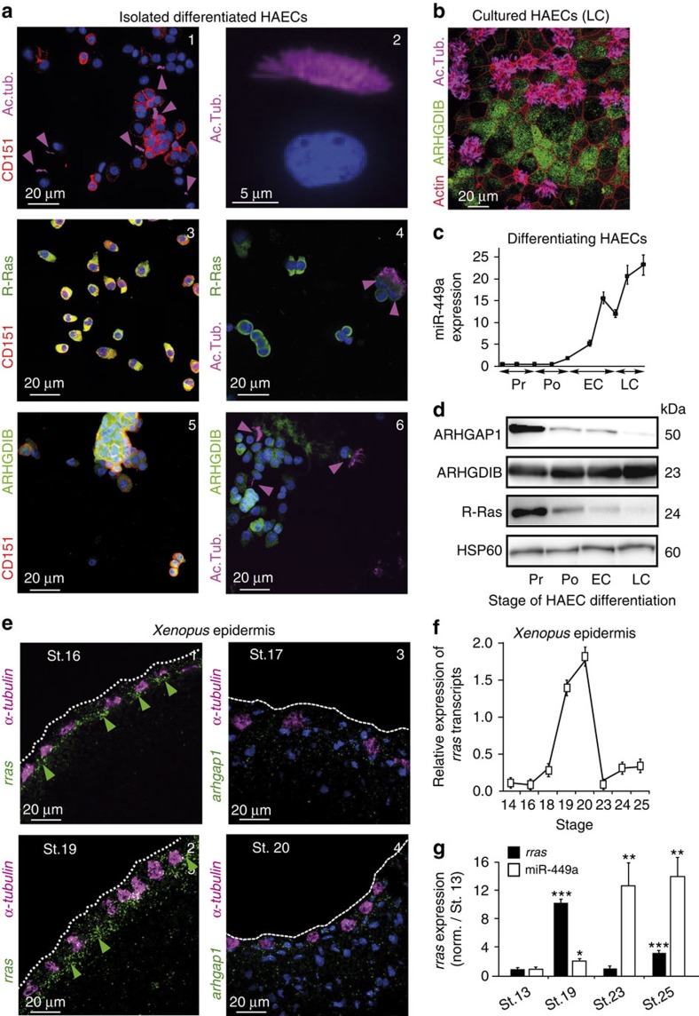 Figure 5. Cellular specificity of expression of ARHGAP1, ARHGDIB and R-Ras during MCC differentiation.(a,b) Fluorescence immunocytochemistry experiments on cytospins from dissociated HAECs (a1â6) and primary HAEC cultures at LC step (b) illustrate the cell-specific expression of human ARHGDIB (in green, a5â6,b) and R-Ras proteins (in green, a3,4). Basal and ciliated cells are CD151+ (in red, a1,3,5) or acetylated tubulin+ (in magenta a2,4,6 and b), respectively. Panel a2 is a magnification of an isolated acetylated tubulin-positive MCC. HAECs are stained for nuclei with 4,6-diamidino-2-phenylindole (DAPI; in blue, a1â6), F-Actin with phalloidin (in red, b). Expression levels of miR-449a (c) and of ARHGAP1, ARHGDIB and R-Ras proteins (d) during HAEC differentiation. MiR-449 levels are normalized with RNU44 (c) and HSP60 was used as a loading control (d). (e) FISH analysis of rras (e1,2) and arhgap1 (e3,4) mRNA on sections of Xenopus embryonic epidermis at stages 16 and 19 (e1,2) or at stages 17 and 20 (e3,4). MCC precursors are positive for α-tubulin (magenta; e1â4). DAPI staining is in blue and white dotted lines indicate the surface of the outer layer. (f) Real-time RTâPCR of rras transcripts in Xenopus epidermis performed at each corresponding stages indicted in the figure. (g) Transcript levels of rras decrease concomitantly with the induction of miR-449 expression. Transcript levels of rras and miR-449 were normalized and compared with their respective values obtained in stage 13. Transcript levels of rras were normalized against Odc transcript as an internal control and miR-449 expression was normalized with U2 as an internal control. Data represent the mean and s.d. of three independent experiments (***P<0.001, **P<0.01 and *P<0.05; Student's t-test). |