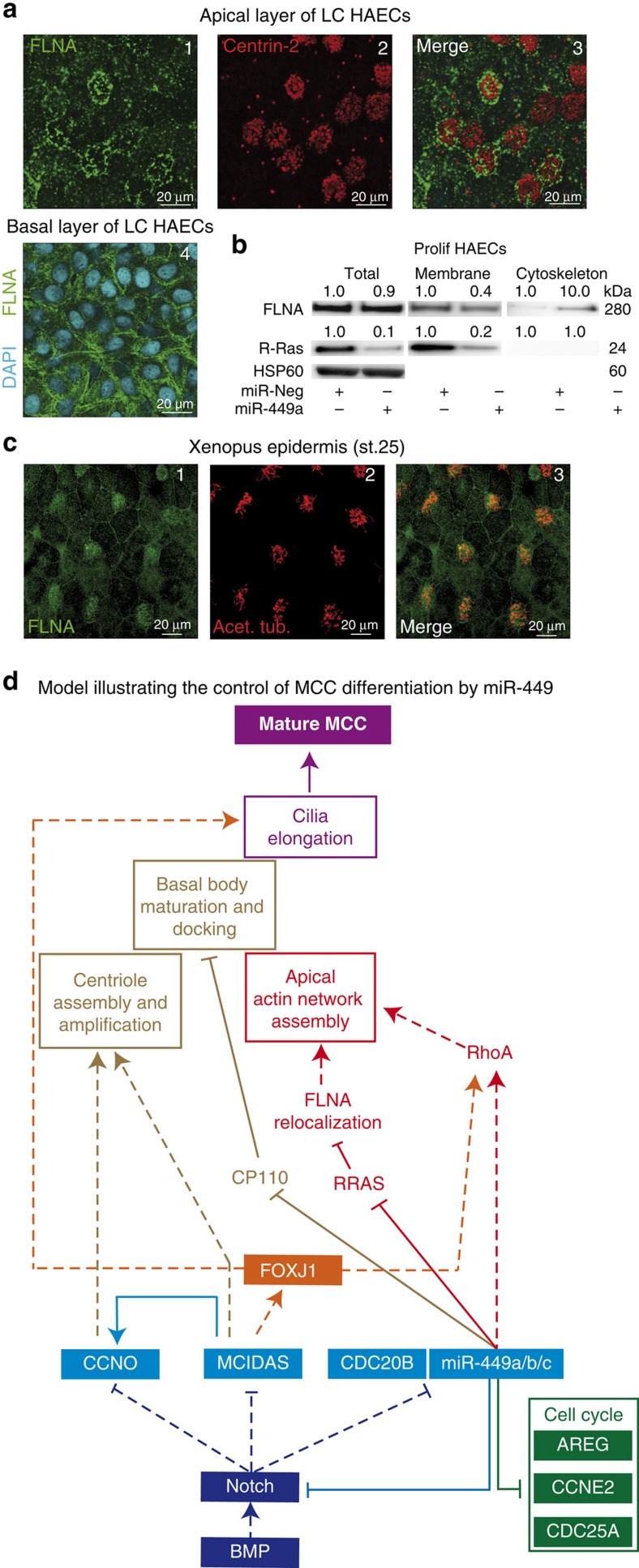 Figure 8. MiR-34/449 promote FLNA relocalization during MCC differentiation.(a) Apical layer of differentiated HAECs (LC stage) were stained for the basal bodies marker centrin-2 (in red) and the actin-binding protein filamin-A (FLNA, in green). FLNA labelling was enriched in the apical layer near basal bodies (a1â3). Basal layer of differentiated HAECs (LC stage) were stained for FLNA (in green) and for nuclei with 4,6-diamidino-2-phenylindole (DAPI; in blue) (a4). (b) Modulation of protein levels of FLNA and R-Ras in total fraction (Total), membrane fraction (Membrane) and cytoskeletal fraction (Cytoskeleton) isolated from proliferating HAECs transfected for 72âh with miR-Neg or miR-449a as indicated each below corresponding band. Protein levels were normalized against HSP60 as an internal control for the total fraction and normalized fold changes are indicated above the corresponding bands. Data were representative of three independent experiments. (c) In the epidermis of stage 25 Xenopus embryos, FLNA labelling (in green, c1) is apically enriched in acetylated tubulin-positive MCCs (in magenta, c2,3). (d) Model illustrating the roles of miR-449 and other interconnected actors in MCC differentiation. Early cues required to trigger MCC differentiation involve the inhibition of BMP and Notch pathway. The expression of Multicilin (MCIDAS), CCNO and miR-449 is controlled by the Notch pathway activity. Notch repression is associated with the increase in MCIDAS, CCNO and miR-449 expression. Then, miR-449 miRNAs repress the Notch pathway inducing a double-negative feedback loop increasing miR-449 expression. MiR-449 inhibit cell cycle-related genes to stop proliferation and promote entry in differentiation. In addition, MCIDAS drives expression of centriole multiplication-related genes including CCNO, which then participates to centriole assembly and amplification. MCIDAS also contributes to increase FOXJ1 expression, which in turn controls ciliogenesis-related genes and apical actin remodelling through a RhoA-dependent mechanism. In parallel, miR-449 also control apical actin network remodelling by repressing R-Ras, promoting FLNA redistribution and modulating RhoA activity. Finally, miR-449 favour basal body maturation and anchoring by downregulating CP110. All these events are key pre-requisites for axoneme elongation and motile cilia formation during MCC differentiation. Plain lines indicate direct interactions; dotted lines identify pathways that may or may not be direct. |