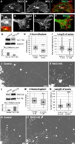 FIGURE 1:. TACC3 protein is expressed within embryonic neuronal growth cones and promotes axon outgrowth. (AâF) Immunostaining with antibodies to TACC3 (A) and tubulin (B) in cultured embryonic neural crest cells confirm that TACC3 is enriched at the centrosome (C, Aâ²âCâ²), in addition to being present in puncta throughout the cell. (DâF) TACC3 antibody also strongly stains growth cones. Scale bar, 5 μm. (G) Western blot showing that a morpholino (MO) targeted against TACC3 results in 50% knockdown (KD) by 2 d postfertilization. Bar graph depicts densitoÂmetry of blot shown; however, similar results were obtained with >20 individual Western blots (unpublished data). (HâI) Axon outgrowth parameters after 24 h in culture were quantified in control and TACC3 KD conditions. (H) The numbers of axons per neural tube explant were counted from three independent experiments. (I) The distance from explant to growth cone was measured to calculate the length of axons from three independent experiments. (JâK) Representative phase contrast microscopy images of axons from control and TACC3 KD. (L) Western blot showing that TACC3 levels are increased (overexpressed [OE]) 2 d after injecting embryos with TACC3 mRNA. Bar graph depicts densitometry of blot shown; however, similar results were obtained with >20 individual Western blots (unpublished data). Note that the TACC3 blot in L was exposed for a shorter amount of time than the one in G, which explains the fainter control band in L. (M, N) Axon outgrowth parameters after 18 h in culture were quantified in control and TACC3 OE conditions. (OâP) Representative phase contrast microscopy images of axons from control and TACC3 OE. Box-and-whisker plots indicate the mean (diamond), median, extrema, and quartiles. An unpaired t test was performed to assess significance between conditions. **p < 0.01, ***p < 0.001; n.s., not significant. Bar, 50 μm (J, K, O, P). |