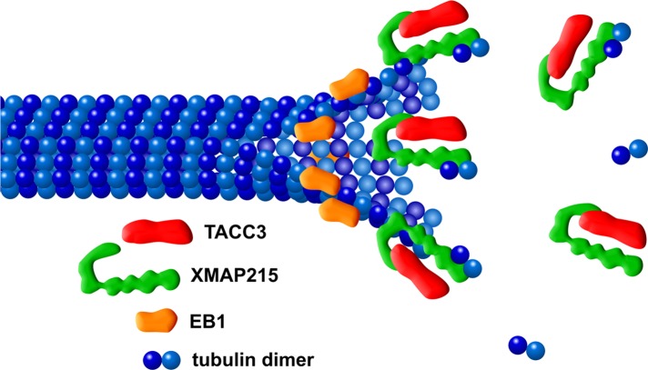 FIGURE 8:. Cartoon schematic of proposed model of TACC3 interaction at MT plus ends. Both TACC3 (red) and XMAP215 (green) bind to the extreme MT plus end. TACC3 and XMAP215 are known to interact with each other through their C-terminal domains (Lee et al., 2001; Thakur et al., 2014), whereas XMAP215 can bind to tubulin dimers through its N-terminal TOG domains (Widlund et al., 2011). TACC3 and XMAP215 complex formation in the cytoplasm may serve to stabilize each other (Bellanger and Gonczy, 2003; Figure 7), and TACC3 interaction with XMAP215 may promote more efficient binding of the complex to MTs in order to drive MT polymerization activity (Kinoshita et al., 2005; Peset et al., 2005). It is unknown whether TACC3 can bind to MT plus ends directly or only through XMAP215 (as depicted here). EB1 (orange) binding to MT plus ends is behind TACC3 and XMAP215 (Figure 6). Not drawn to scale. |