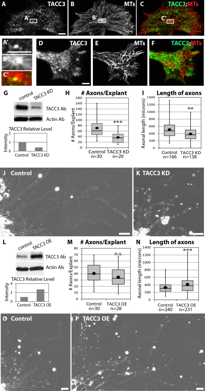FIGURE 1:. TACC3 protein is expressed within embryonic neuronal growth cones and promotes axon outgrowth. (A–F) Immunostaining with antibodies to TACC3 (A) and tubulin (B) in cultured embryonic neural crest cells confirm that TACC3 is enriched at the centrosome (C, A′–C′), in addition to being present in puncta throughout the cell. (D–F) TACC3 antibody also strongly stains growth cones. Scale bar, 5 μm. (G) Western blot showing that a morpholino (MO) targeted against TACC3 results in 50% knockdown (KD) by 2 d postfertilization. Bar graph depicts densitometry of blot shown; however, similar results were obtained with >20 individual Western blots (unpublished data). (H–I) Axon outgrowth parameters after 24 h in culture were quantified in control and TACC3 KD conditions. (H) The numbers of axons per neural tube explant were counted from three independent experiments. (I) The distance from explant to growth cone was measured to calculate the length of axons from three independent experiments. (J–K) Representative phase contrast microscopy images of axons from control and TACC3 KD. (L) Western blot showing that TACC3 levels are increased (overexpressed [OE]) 2 d after injecting embryos with TACC3 mRNA. Bar graph depicts densitometry of blot shown; however, similar results were obtained with >20 individual Western blots (unpublished data). Note that the TACC3 blot in L was exposed for a shorter amount of time than the one in G, which explains the fainter control band in L. (M, N) Axon outgrowth parameters after 18 h in culture were quantified in control and TACC3 OE conditions. (O–P) Representative phase contrast microscopy images of axons from control and TACC3 OE. Box-and-whisker plots indicate the mean (diamond), median, extrema, and quartiles. An unpaired t test was performed to assess significance between conditions. **p < 0.01, ***p < 0.001; n.s., not significant. Bar, 50 μm (J, K, O, P). |