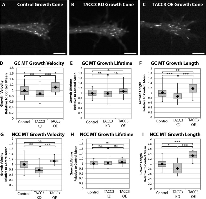 FIGURE 2:. TACC3 regulates MT dynamics in X. laevis growth cones and neural crest cells. (A–C) Representative micrographs of EB1-GFP comets in control (A), TACC3 KD (B), and TACC3 OE (C) conditions. See Figure 2 Supplemental Movies S1–S4. Bar, 5 μm. (D–F) Quantification of MT growth track parameters in cultured embryonic neuronal growth cones (GC) after TACC3 manipulation. EB1-GFP localizes to the ends of growing MTs and is thus a marker for MT polymerization. Automated tracking of EB1-GFP comets calculate MT growth-track velocity (D), MT growth-track lifetime (E), and MT growth-track length (F). Examples of actual mean values for a single experiment: GC MT velocity, control, 6.4 μm/min; TACC3 KD, 5.7 μm/min; TACC3 OE, 7.1 μm/min. GC MT lifetime, control, 12.6 s; KD, 13.3 s; OE, 14.1 s. GC MT length, control, 1.4 μm; KD, 1.3 μm; OE, 1.7 μm. NCC MT velocity, control, 7.5 μm/min; KD, 6.0 μm/min; OE, 8.5 μm/min. NCC MT lifetime, control. 11.4 s; KD. 13.0 s; OE, 12.1 s. NCC MT length, control, 1.3 μm; KD, 1.3 μm; OE, 1.8 μm. For each independent experiment (six were performed in total), measurements of MT parameters were normalized to their respective experimental control means due to the significant day-to-day fluctuations in control MT dynamics (in part, due to room temperature changes). Control data represent the means of 44 growth cones, representing a total of 1228 analyzed tracks; TACC3 KD represents 49 growth cones with 964 tracks; TACC3 OE represents 24 growth cones with 524 tracks. (G–I) Quantification of MT growth-track parameters in cultured embryonic neural crest cells. Control data represent the means of 20 neural crest cells, representing a total of 2876 analyzed tracks; TACC3 KD represents 13 cells with 1313 tracks; TACC3 OE represents 10 cells with 1386 tracks. Box-and-whisker plots indicate the mean (diamond), median, extrema, and quartiles. An unpaired t test was performed to assess significance between conditions. *p < 0.05, **p < 0.01, ***p < 0.001; ns, not significant. |