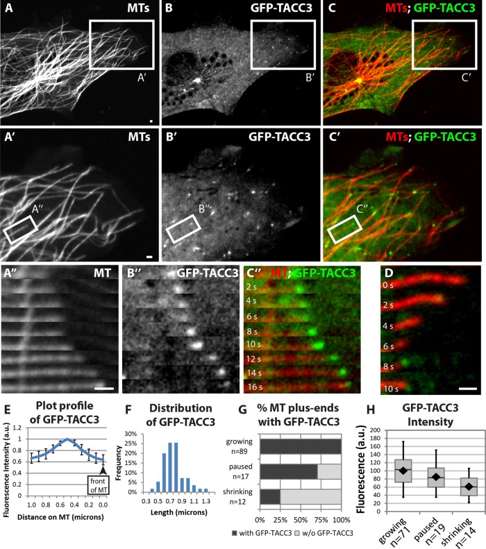 FIGURE 4:. TACC3 can act as a +TIP in nonneuronal embryonic cells. (AâC) Expression of mKate2-tubulin (A), GFP-TACC3 (B), and merge (C) in cultured fibroblasts derived from embryonic somitic mesoderm. See Figure 4 Supplemental Movie 1. (Aâ²âCâ²) Magnified views of the boxed regions in AâC. See Figure 4 Supplemental Movie 2. (Aâ²â²âCâ²â²) Magnified time-lapse montages of the boxed regions in Aâ²âCâ². (D) Time-lapse montage of another MT in the process of undergoing catastrophe, with GFP-TACC3 localizing. (E) Fluorescence intensity profile of line-scan average from 43 MT plus ends. (F) Histogram depicting the distribution of lengths of detectable GFP-TACC3 localization on the plus ends of MTs. (G) Percentage of MT plus ends with GFP-TACC3 localization for different MT dynamics instability states. (H) Quantification of mean fluorescence intensity of 4 à 4 pixel square of GFP-TACC3 accumulation on the ends of MTs, when visible. Box-and-whisker plots indicate the mean (diamond), median, extrema, and quartiles. Bar, 1 μm. |