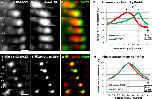 FIGURE 6:. TACC3 localization on MT plus ends is more distal than EB1 and overlaps with XMAP215. (A–C) Representative time-lapse montage of GFP-TACC3 (A) and mKate2-EB1 (B) accumulation on growing MT plus end. MT is growing to the right. Merged image (C) highlights the spatial arrangement between GFP-TACC3 and mKate2-EB1 localizations. These images were compiled by translating the TACC3 channel on the x-axis, after calculating the frame-to-frame velocity of the growing MT plus end, in order to account for the 1-s time delay between channels, for each examined MT (using ImageJ Translate function). To further confirm correct translation, uncorrected time-lapse colocalizations were examined with both combinations of imaging—red channel first, green channel second; then green channel first, red channel second. (D) Fluorescence intensity profiles of GFP-TACC3 and mKate2-EB1. GFP-TACC3 and mKate2-EB1 signals from 12 individual MTs were quantified by intensity line scans to present the relative fluorescence intensity profiles, with the plus end of the MT toward the right. The highest-intensity peak of GFP-TACC3 is ∼0.5 μm distal to the peak of mKate2-EB1. (E–G) Representative time-lapse montage of mKate2-TACC3 (E) and XMAP215-GFP (F) accumulation on growing MT plus end. MT is growing to the right. Merged image (G) shows that mKate2-TACC3 and XMAP215-GFP localizations overlap. (H) Fluorescence intensity profiles of mKate2-TACC3 and XMAP215-GFP. mKate2-TACC3 and XMAP215-GFP signals from 11 individual MTs were quantified by intensity line scans to present the relative fluorescence intensity profiles. Note that peak intensities of mKate2-TACC3 and XMAP215-GFP closely align. Bar, 0.5 μm. |