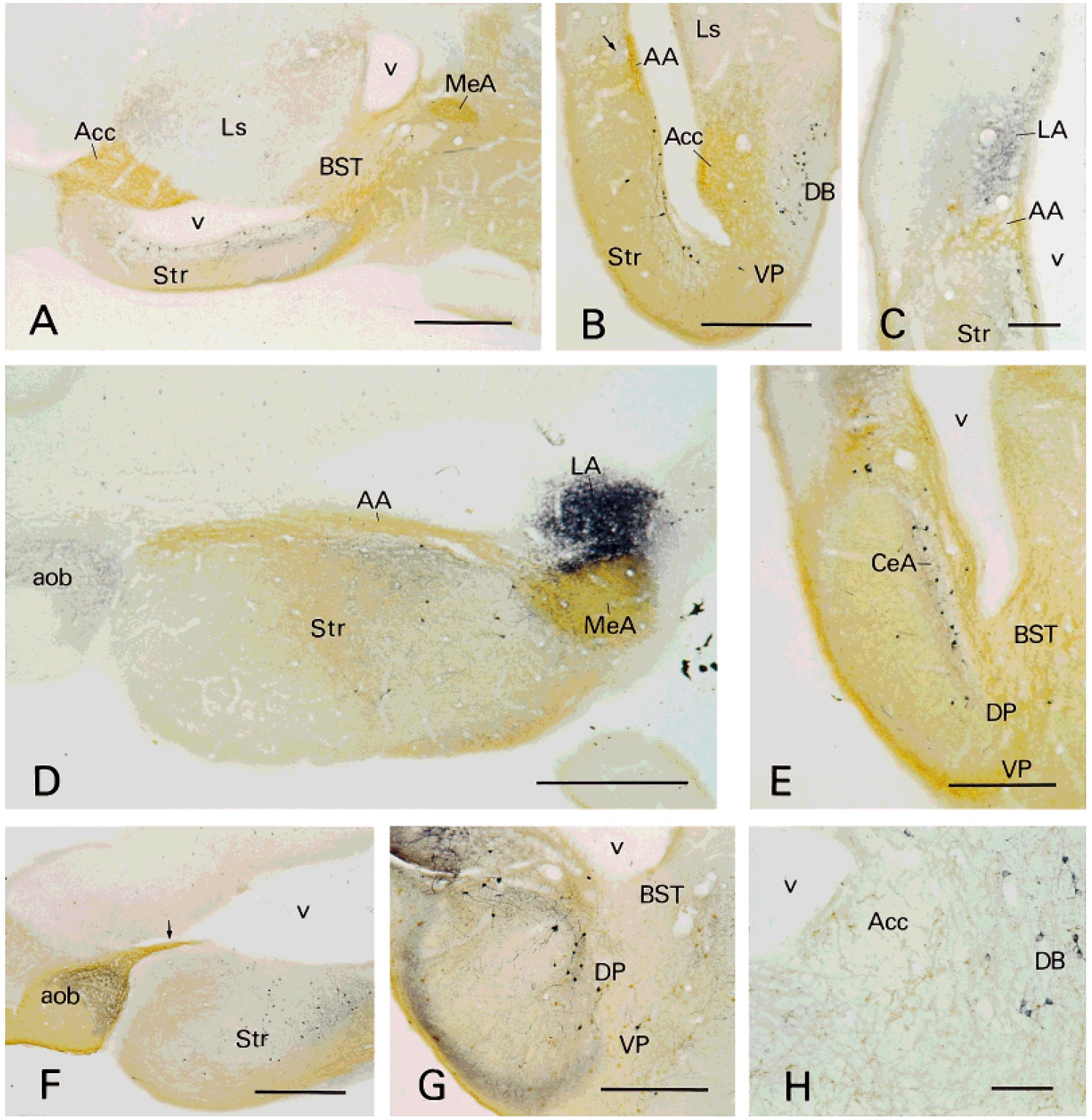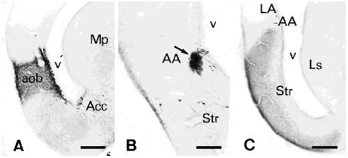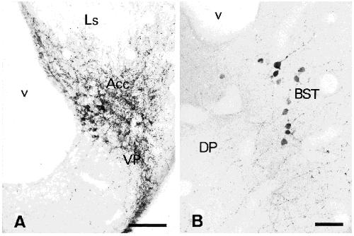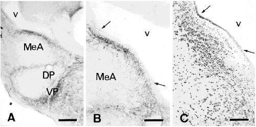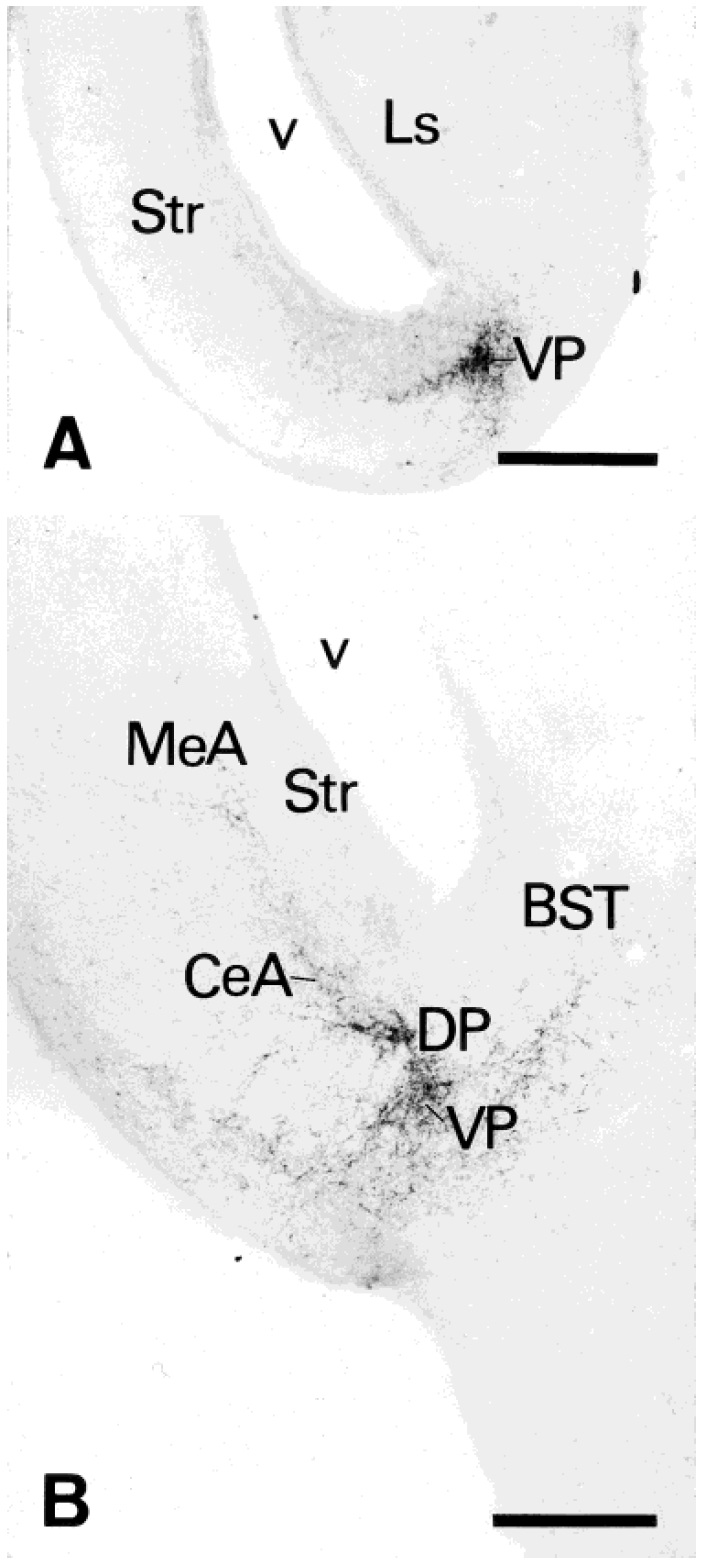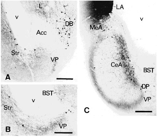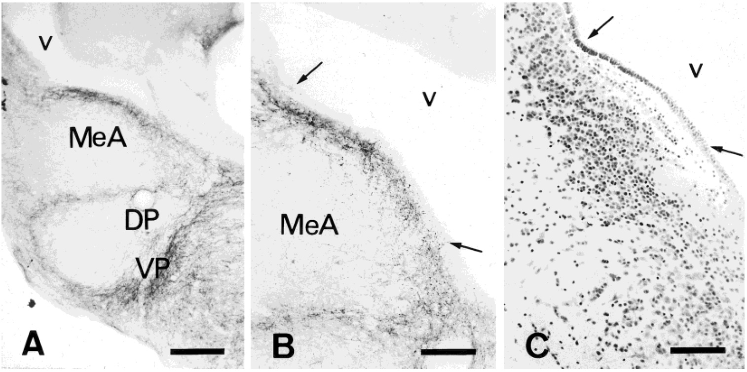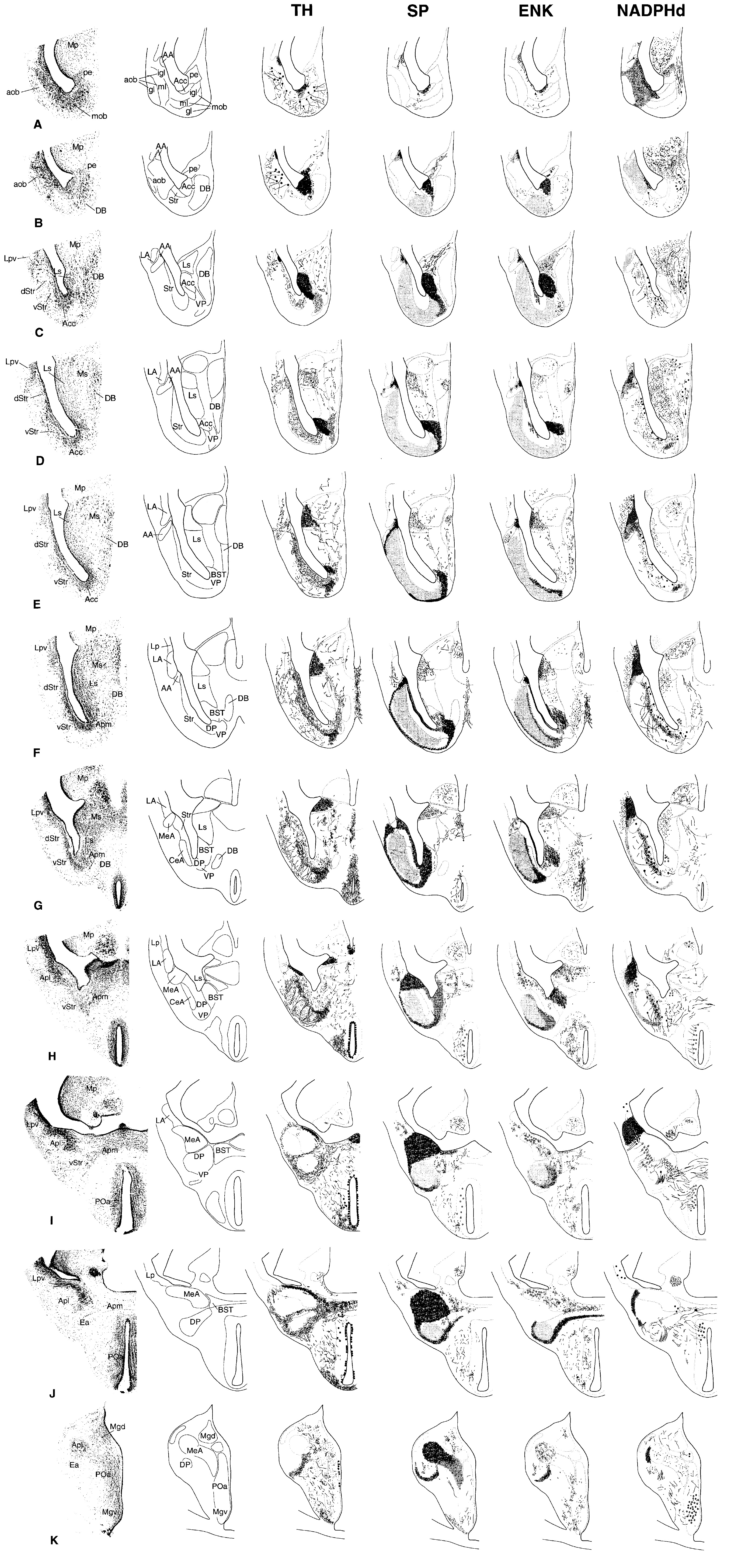 Recent studies dealing with the investigation of the afferent and efferent connections of the basal ganglia of amphibians have revealed many similarities with basal ganglia structures of amniotes. In a further step, the chemoarchitecture of basal ganglia of the frog Rana perezi has been investigated. For use as main markers of amphibian basal ganglia structures, antibodies against tyrosine hydroxylase, substance P, and enkephalin were selected. Moreover, the distributions of nitric oxide synthase (nicotinamide adenine dinucleotide phosphate-diaphorase histochemistry), calretinin, dopamine-beta-hydroxylase, choline acetyltransferase, mesotocin, vasotocin, somatostatin, neuropeptide Y, neuropeptide FF, and serotonin were studied to corroborate a comparison with both basal ganglia and amygdaloid structures of amniotes. On the basis of connections and chemoarchitecture, a striatum proper, nucleus accumbens, dorsal and ventral pallidum, bed nucleus of the stria terminalis, and amygdaloid complex have been identified. Accordingly, a new terminology is proposed that is in line with our current understanding of basal ganglia organization in amphibians.