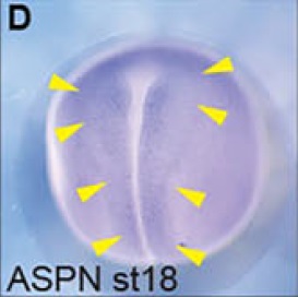 aspn (asporin) gene expression in Xenopus laevis embryo, assayed via in situ hybridization, NF stage 18, dorsal view, anterior up. |