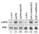 Figure S4. Both IGF and ASPN are required for the full activation of ERK. Animal cap explants were prepared from 3 ng control ï¢-Galactosidase (i,ii,iv), 3ng dnIGFR mRNA (iii), 20 ng control-MO (v) or 20 ng ASPN-MO (vi) injected embryos and were incubated with the conditioned media expressing control (i,iv), ASPN (ii,iii) or IGF2 (v,vi) for 20 minutes. The explants were analysed by western blotting using phosphor-ERK or ERK antibodies. |