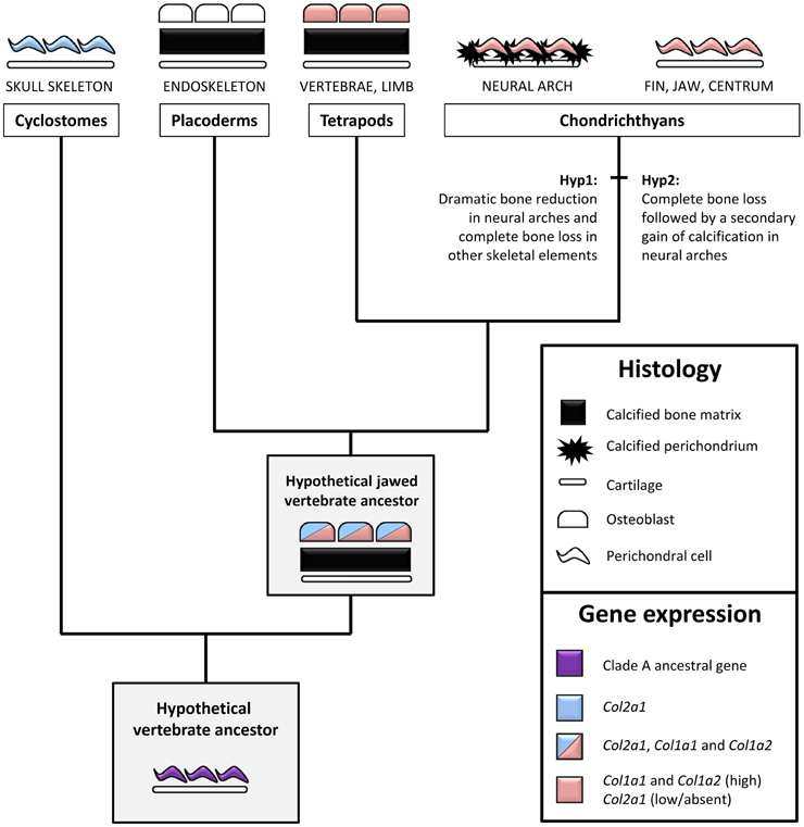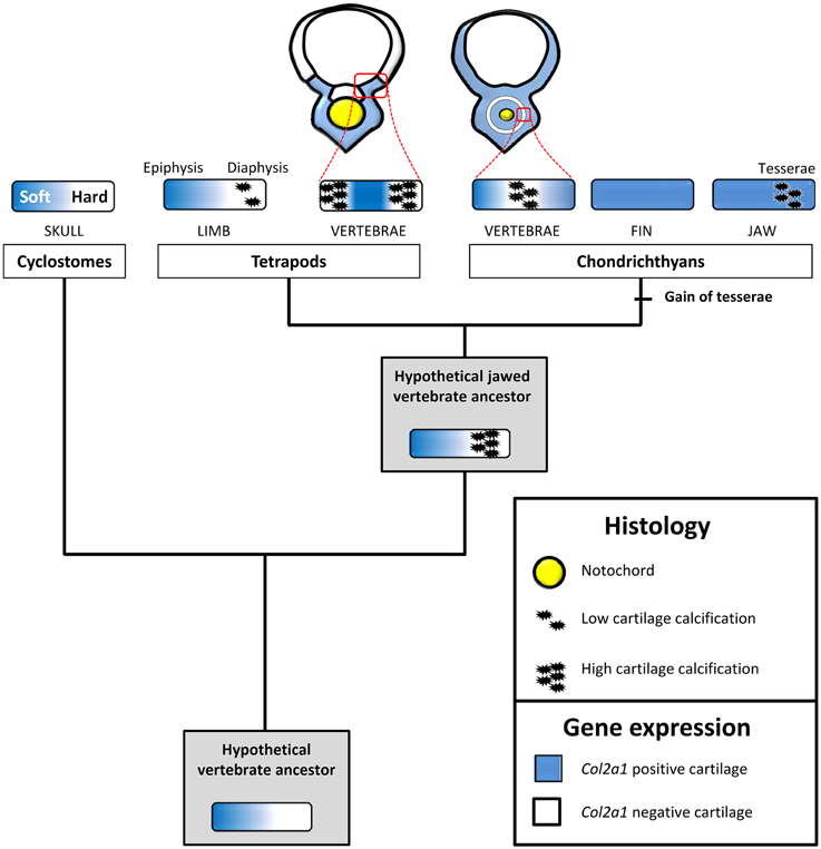 Understanding the evolutionary emergence and subsequent diversification of the vertebrate skeleton requires a comprehensive view of the diverse skeletal cell types found in distinct developmental contexts, tissues, and species. To date, our knowledge of the molecular nature of the shark calcified extracellular matrix, and its relationships with osteichthyan skeletal tissues, remain scarce. Here, based on specific combinations of expression patterns of the Col1a1, Col1a2, and Col2a1 fibrillar collagen genes, we compare the molecular footprint of endoskeletal elements from the chondrichthyan Scyliorhinus canicula and the tetrapod Xenopus tropicalis. We find that, depending on the anatomical location, Scyliorhinus skeletal calcification is associated to cell types expressing different subsets of fibrillar collagen genes, such as high levels of Col1a1 and Col1a2 in the neural arches, high levels of Col2a1 in the tesserae, or associated to a drastic Col2a1 downregulation in the centrum. We detect low Col2a1 levels in Xenopus osteoblasts, thereby revealing that the osteoblastic expression of this gene was significantly reduced in the tetrapod lineage. Finally, we uncover a striking parallel, from a molecular and histological perspective, between the vertebral cartilage calcification of both species and discuss the evolutionary origin of endochondral ossification.